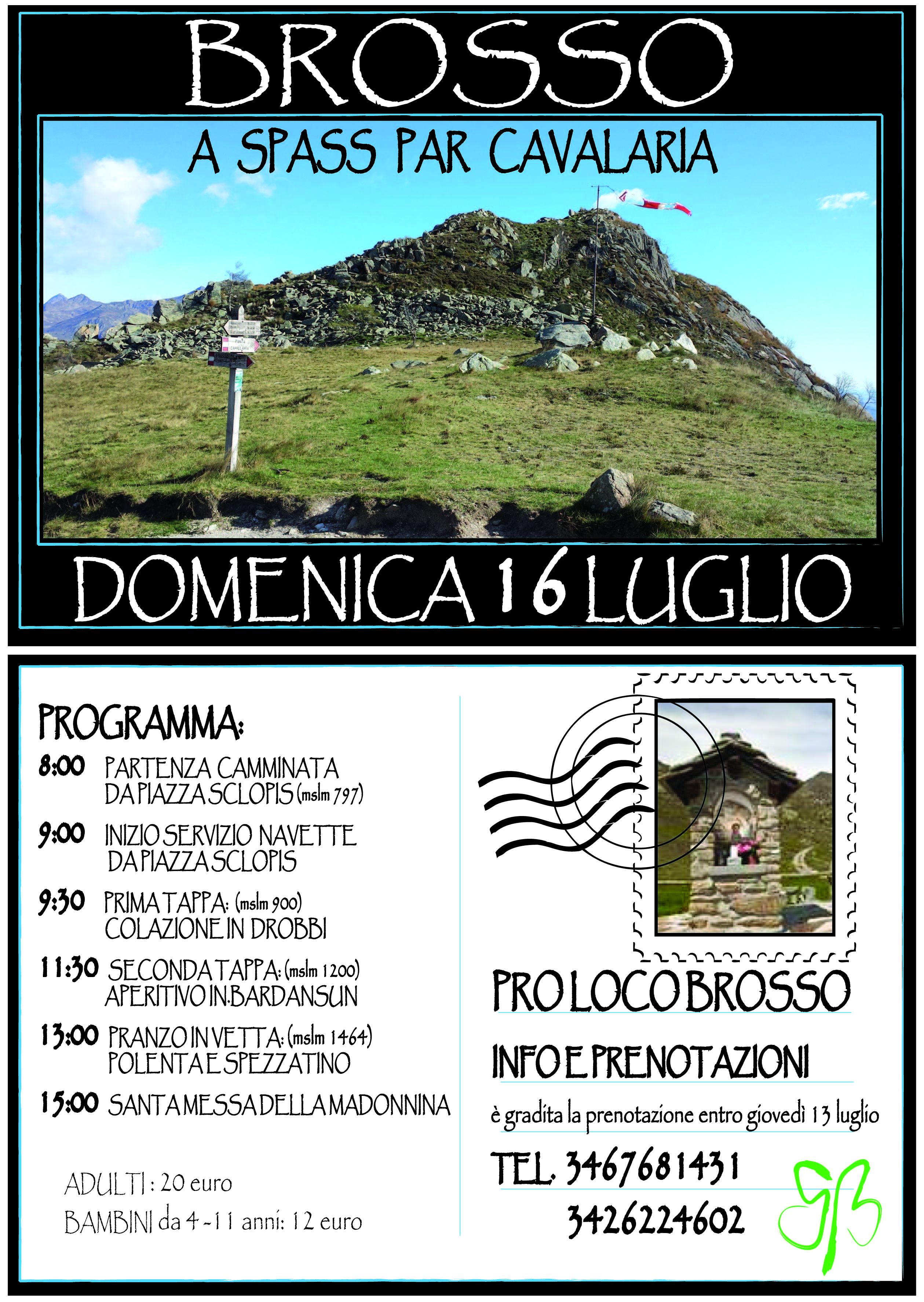 Si tratta di una festa che unisce in una giornata particolare, lo spirito sacro con la goliardia e la voglia di stare insieme in un ambiente sano e incontaminato. La giornata inizia nella prima mattinata con la partenza della processione religiosa da Brosso, la quale si inerpica per i sentieri che conducono al Monta Cavallaria. Durante il tragitto si sosta in alcune baite che si incontrano nel passagio per il ristoro. Giunti in vetta si conclude il pranzo con polenta e spezzatino. Nel pomeriggio viene celebrata la Santa Messa all’aperto.